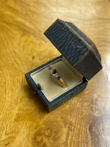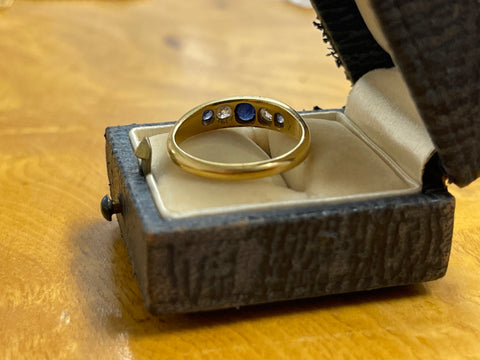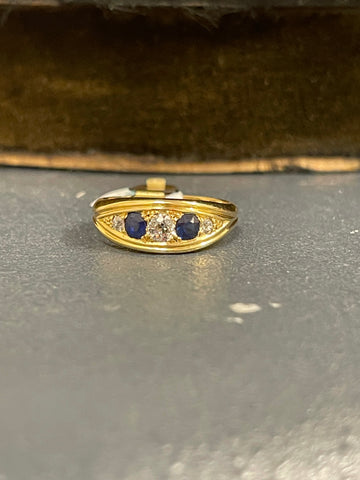 18ct gold and set with two old cut diamonds and three sapphires.