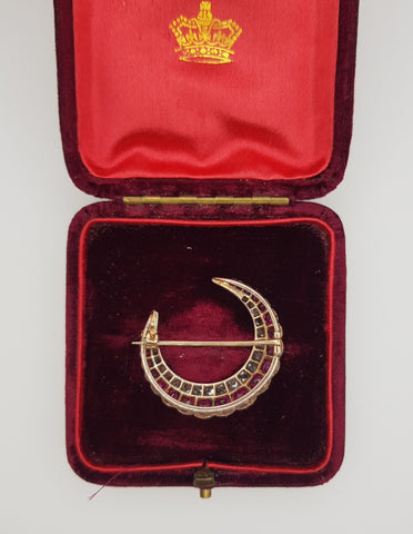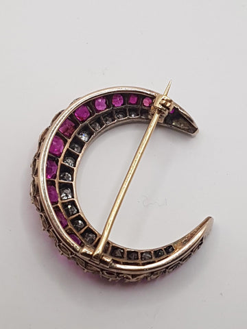 9ct gold and silver diamond and ruby antique crescent brooch.