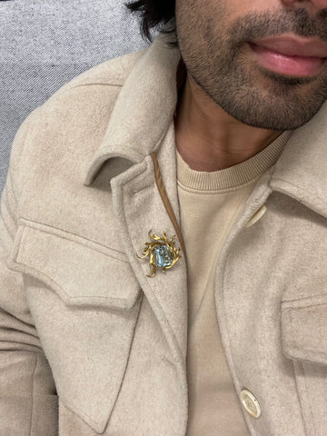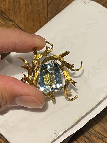 A beautiful vintage aquamarine brooch new in this week. The central natural aquamarine measures 16.7 x 13.3mm (approximately 10cts) and is set in a textured 18ct gold mount. A crisp clean piece looking for its next home. Circa 1970.