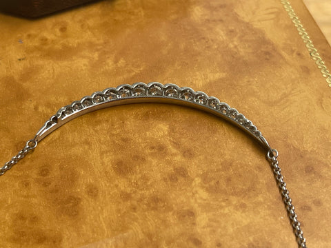 A beautiful old cut diamond open crescent necklace. The vintage 18ct crescent is set with just over 2cts of old cut diamonds. The diamonds are very bright and well matched (G/H VS approximately). At some point in it’s life the piece was converted into a necklace with the addition of a 14ct white gold chain. The crescent is 5.5cm in width and the necklace is 43.5cm end to end.